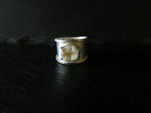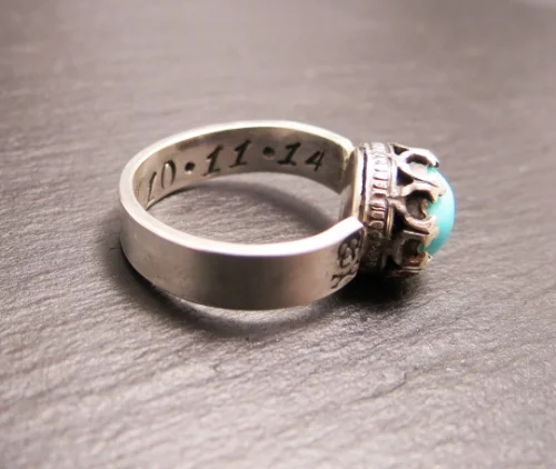 This silver ring was made to hold the ashes of a beloved dog, Dane. The band features wing details and Dane's name is stamped on the inside of the band.