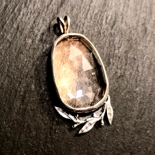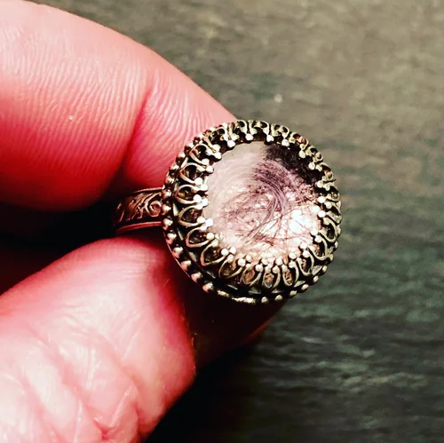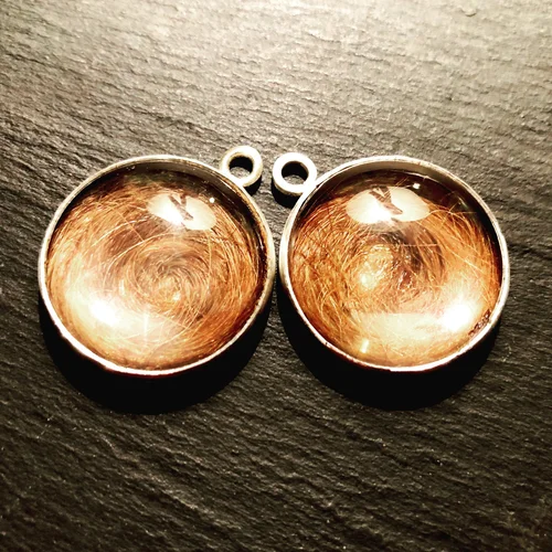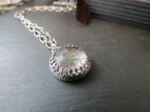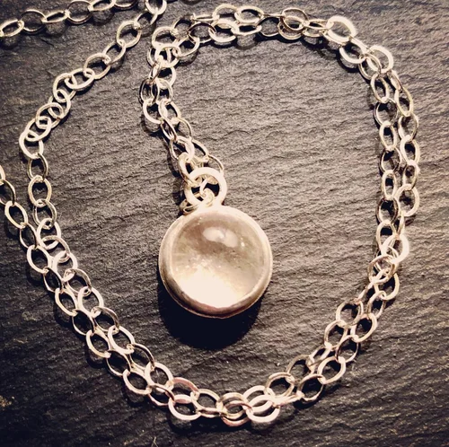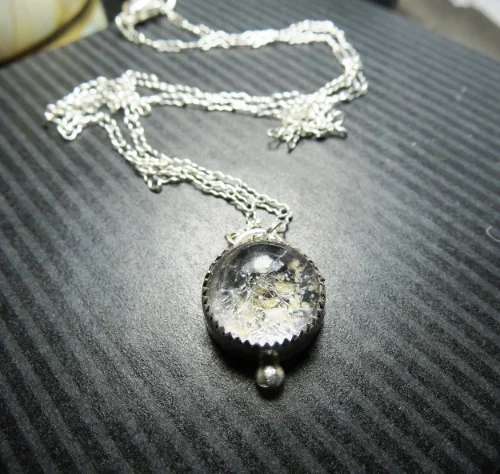 This silver pendant necklace was made with a 12 mm quartz stone. It holds strands of fur and ashes of a beloved dog under the stone. Domed smooth quartz will magnify the materials it sits over.