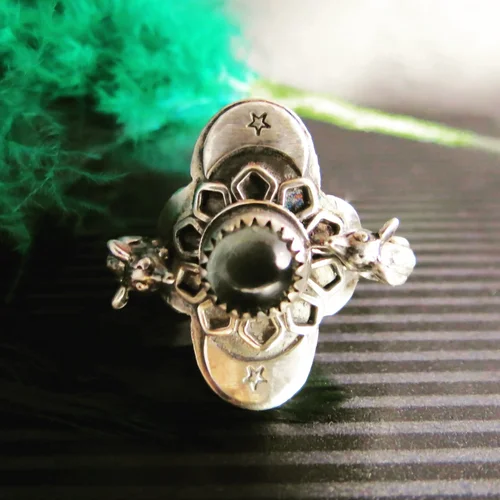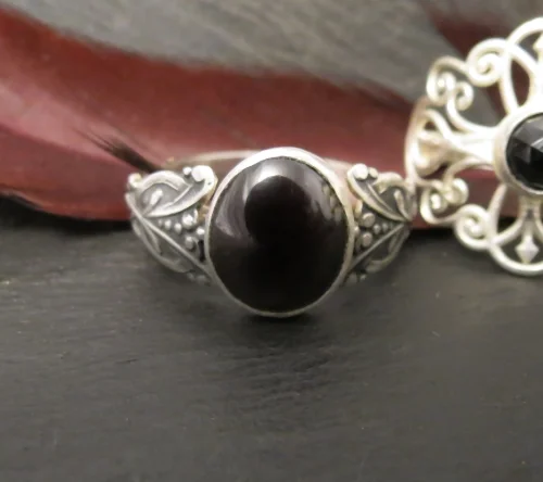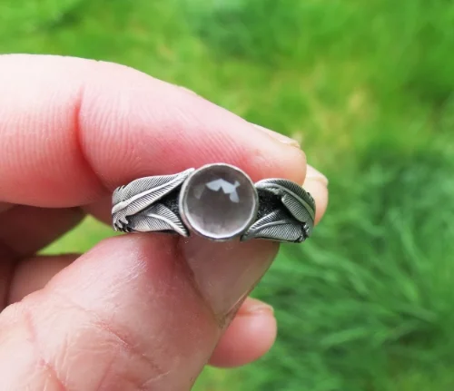 This silver ring with leaf accents holds cremains of a mother. The stone in the setting is diopside.