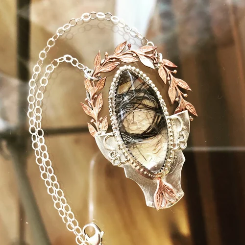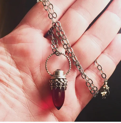 This small necklace pendant or charm holds a bullet shaped garnet, the most recent one I made was to have ashes of a pet snake put in the setting. The long prongs on this design makes it possible for client's to insert the ash and set the stone themselves if they'd like to do it themselves.